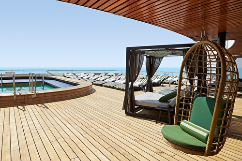 Comfortable king bed that can be converted into two single beds on request Private whirlpool on balcony Sitting area with double sofa bed Spacious closet Bathroom with shower and hairdryer Interactive TV, telephone, safe and minibar Wi-Fi access available Approx. 377 ft2 with a large balcony that is approx. 398 – 495 ft2 Located on decks 15 – 16