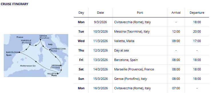 Maršruts: Roma (Civitavecchia) – Mesīna – Valleta – Barselona – Marseļa – Dženova – Roma (Civitavecchia)