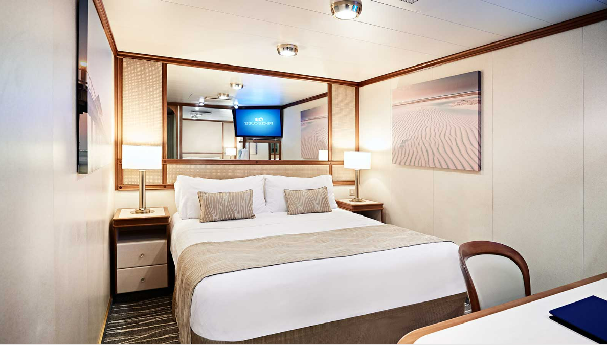 Approximately 200 sq. ft., this well appointed stateroom features a forward-facing cabin for memorable views.