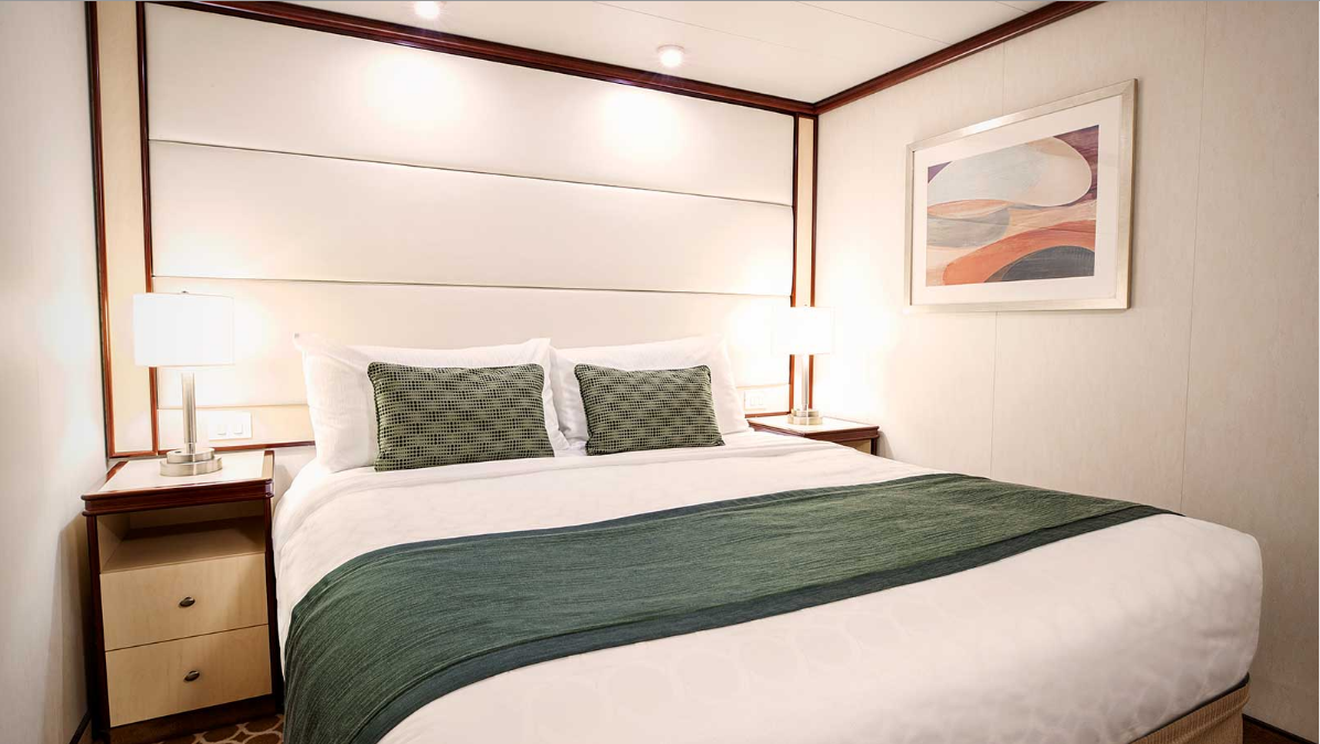 Approximately 166 to 175 sq. ft., this well appointed interior stateroom provides fine amenities. These staterooms are the perfect place to recharge your batteries. Our most affordable option, featuring two twin beds or a queen-size bed. Other amenities include a refrigerator, hair dryer, TV, closet and bathroom with shower. Comfortable queen or two twin beds. Refrigerator. Flat-panel television. Private bathroom with shower. 100% cotton, high-thread count linens. Complimentary 24-hour room service. Spacious closet. Desk with chair. Hair dryer & bathroom amenities. Digital security safe.