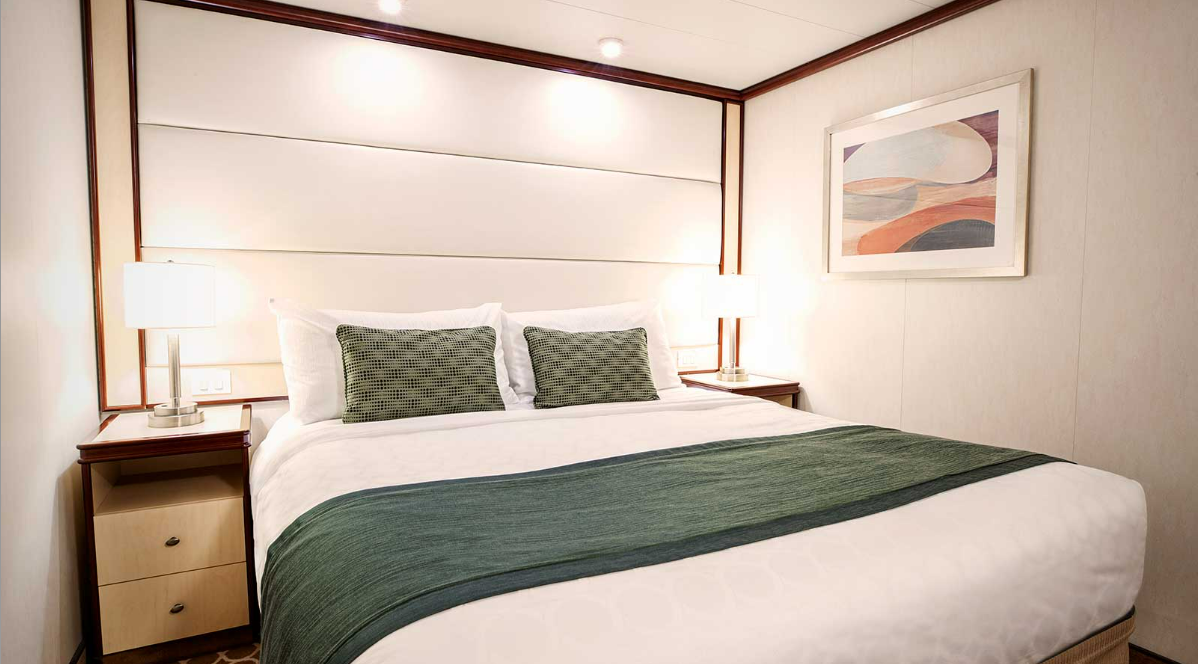 These staterooms are the perfect place to recharge your batteries. Our most affordable option, featuring two twin beds or a queen-size bed. Other amenities include a refrigerator, hair dryer, TV, closet and bathroom with shower.